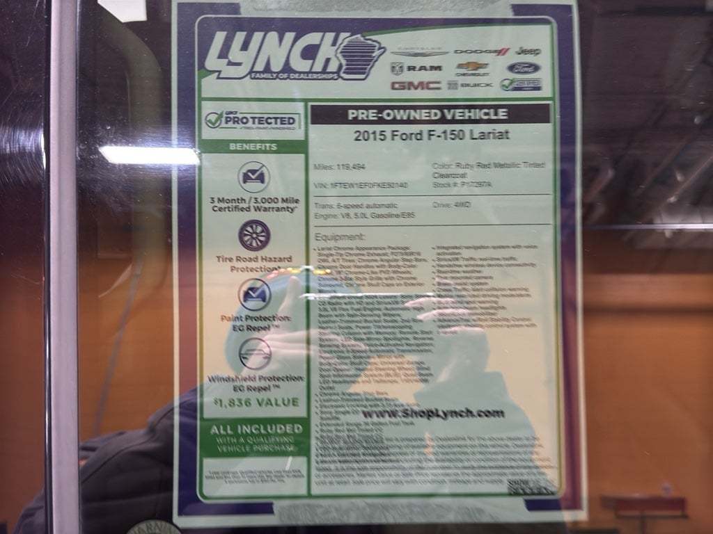 2015 Ford F-150 Lariat 4WD — V8 5.0L, Burlington WI. Looking for power, comfort, and value? This 2015 Ford F-150 Lariat delivers with a robust 5.0L V8 gasoline/E85 engine and four-wheel drive for confident handling in any season. Finished in a clean, well-maintained interior with leather seats and heated front seats, it's built for long drives and cold mornings. Remote start adds convenience on chilly days, and XM Radio keeps you entertained mile after mile.