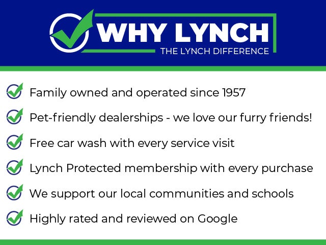 *Dealer Discount applies to everyone *Lynch Market Adjustments are based on the supply and demand of vehicles as well as the current market situation. This takes in to account all factors including the impact of the pandemic and the shortages that exist. Tax, Title, Tags, and Service Fee not included in vehicle prices shown and must be paid by the purchaser. We make every effort to provide accurate information. All prices, specifications and availability subject to change without notice. Price listed assumes vehicle purchased in same zip code as dealership location. Dealer may not be held liable for errors. Pricing may not include Dealer Add-ons and/or Accessories. Special financing may be available in lieu of factory rebates. Contact dealer for most current information. Tax, title, license, and service fee (unless itemized above) are extra. Not available with special finance, lease and some other offers. Manufacturer's Suggested Retail Price may not represent the actual sales price.