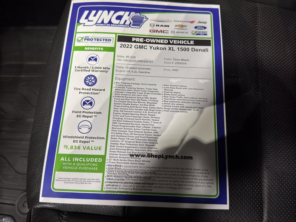 Max Trailering Package: Extra Capacity Cooling System. ProGrade Trailering System: Trailer Side Blind Zone Alert; Smart Trailer Integration Indicator; Integrated Trailer Brake Controller; Hitch Guidance with Hitch View. Preferred Equipment Group 5SA: Bright Front and Rear Door Sill Plates; 2 Presets For Outside Rearview Mirrors; Stop/start System Disable Button; 3rd Row 60/40 Power-Folding Split-Bench Seat; Safety Alert Seat; Chrome Door Handles with Body-Color Strip; Hill Descent Control; 6.2L EcoTec3 V8 Engine; Heated Steering Wheel; Heated Driver and Front Passenger Seats; Wireless Charging; Universal Home Remote; Heated 2nd Row Outboard Position Seats; 3 Years of GMC Connected Services; Hands-Free Power Programmable Rear Liftgat