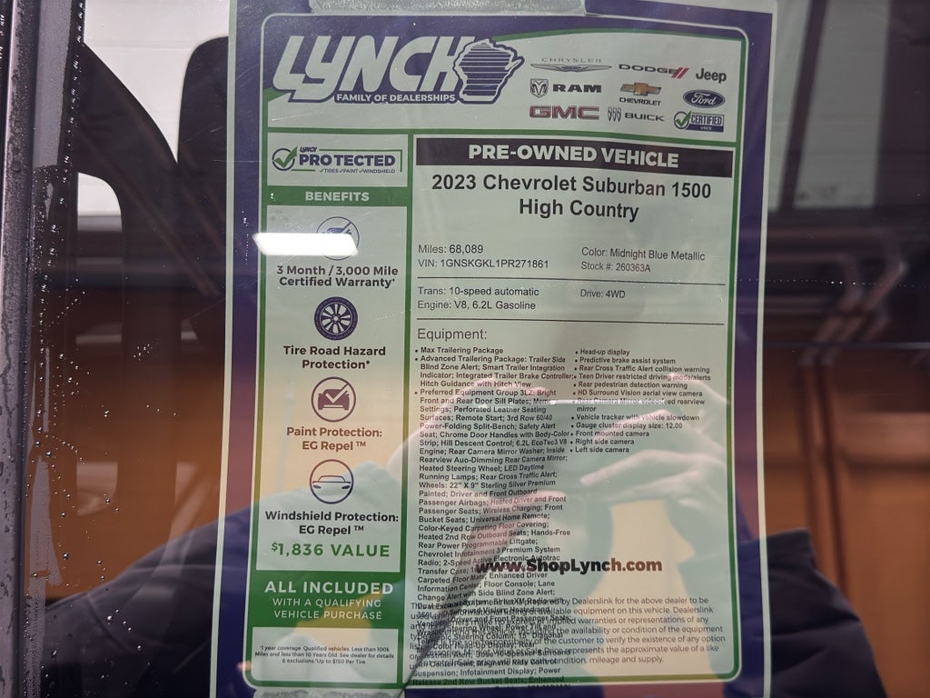 Meticulously maintained and competitively priced, this Chevrolet Suburban represents outstanding value — the best price available for this model in the area. Located in Burlington, WI, it's ready for test drives and immediate delivery. Contact our sales team to schedule an appointment or to get more details, and experience how this 2023 Chevrolet Suburban 1500 High Country blends power, comfort, and technology into a single impressive SUV.