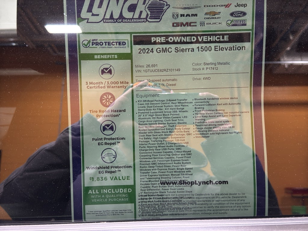 2024 GMC Sierra 1500 Elevation — 4WD, 6‑Cyl 3.0L Diesel, 26,691 miles. Located in Burlington, WI, this rugged and efficient pickup delivers strong towing capability, excellent fuel economy for its class, and the confidence of low mileage at a competitively priced value. Priced to sell, this GMC Sierra offers the best price in the area for buyers seeking diesel performance with modern convenience and safety.