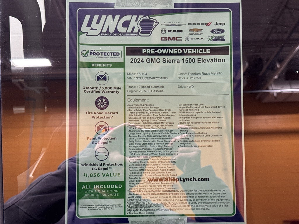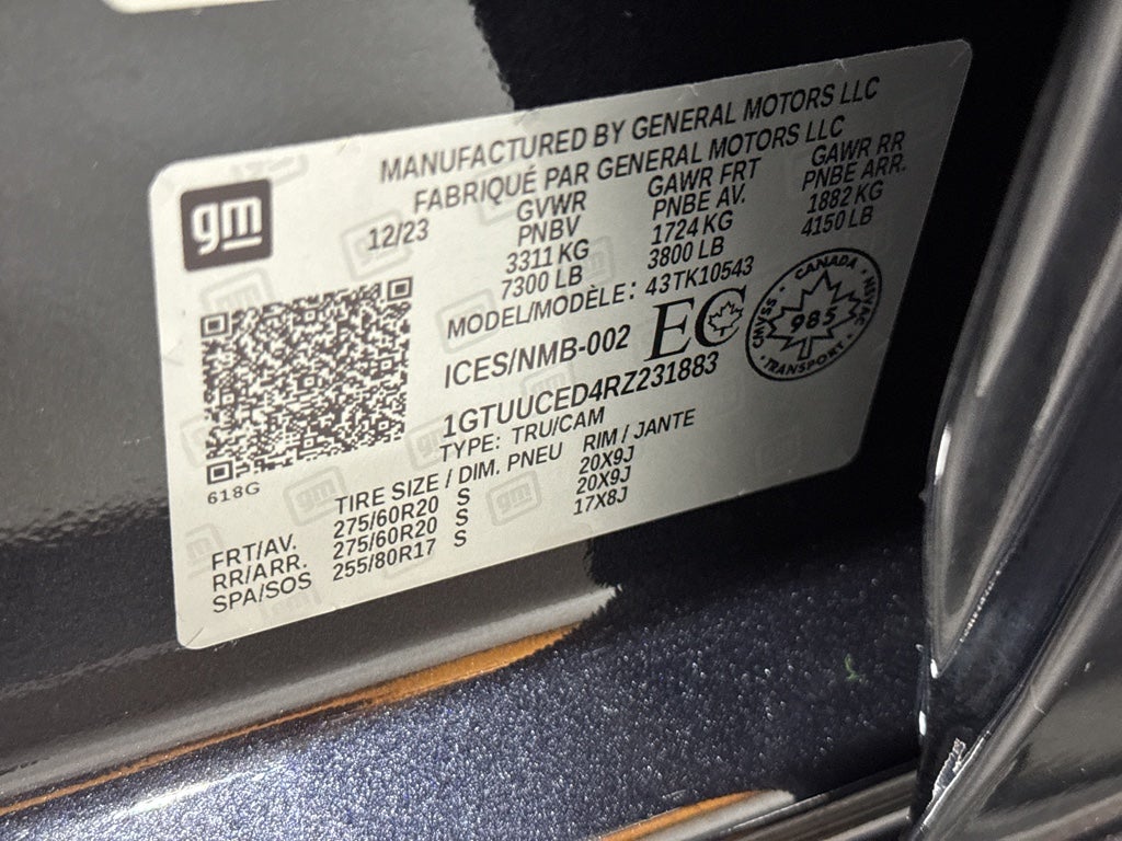 Max Trailering Package. Elevation Premium Package. Sierra Safety Plus Package: Rear Cross Traffic Braking; HD Surround Vision; Trailer Side Blind Zone Alert; Rear Pedestrian Alert; Ultrasonic Front and Rear Park Assist; Perimeter Lighting; Trailer Camera Provisions; High Gloss Black Mirror Caps. Preferred Equipment Group 3SB: Wheels: 20" X 9" High Gloss Black Painted Aluminum; HD Rear Vision Camera; LED Cargo Area Lighting; Remote Vehicle Starter System; Electric Rear-Window Defogger; Theft Deterrent System (unauthorized Entry); Body Colour Header with Gloss Black Mesh Grille Bars; Cloth Rear Seat with Storage Package; GMC Pro Safety; High Capacity Suspension Package; Trailering Package; 120-Volt Interior Power Outlet; 2 Charge/data USB Ports; Steering Wheel Audio Controls; 2 Charge-Only Rear USB Ports; GMC Connected Access Capable; Colour-Keyed Carpeting Floor Covering; OnStar and GMC Connected Services Capable; Power Front Windows with Passenger Express Down; Premium GMC Infotainment Audio System Radio; Deep-Tinted Glass; Power Rear Windows with Express Down; Single Speed Transfer Case; Power Front Windows with Driver Express Up/down; 275/60R20 AS BW Tires; Manual Tilt-Wheel and Telescoping Steering Column; Front Frame-Mounted Black Recovery Hooks; Keyless Open and Start; Wi-Fi Hotspot Capable; Push Button Start; Auto-Locking Rear Differential; Power Door Locks. Preferred Package. Power Sunroof. 6" Rectangular Black Tubular Assist Steps. Front Bucket Seats. Spray-On Pickup Bedliner with GMC Logo. Titanium Rush Metallic. Integrated Trailer Brake Controller. All-Weather Floor Liner. **Equipment listed is based on original vehicle build and subject to change. Please confirm the accuracy of the included equipment by calling the dealer prior to purchase.**Max Trailering Package. Elevation Premium Package. Sierra Safety Plus Package: Rear Cross Traffic Braking; HD Surround Vision; Trailer Side Blind Zone Alert; Rear Pedestrian Alert; Ultrasonic Front and Rear Park Assist; Perimeter Lighting; Trailer Camera Provisions; High Gloss Black Mirror Caps. Preferred Equipment Group 3SB: Wheels: 20" X 9" High Gloss Black Painted Aluminum; HD Rear Vision Camera; LED Cargo Area Lighting; Remote Vehicle Starter System; Electric Rear-Window Defogger; Theft Deterrent System (unauthorized Entry); Body Colour Header with Gloss Black Mesh Grille Bars; Cloth Rear Seat with Storage Package; GMC Pro Safety; High Capacity Suspensi